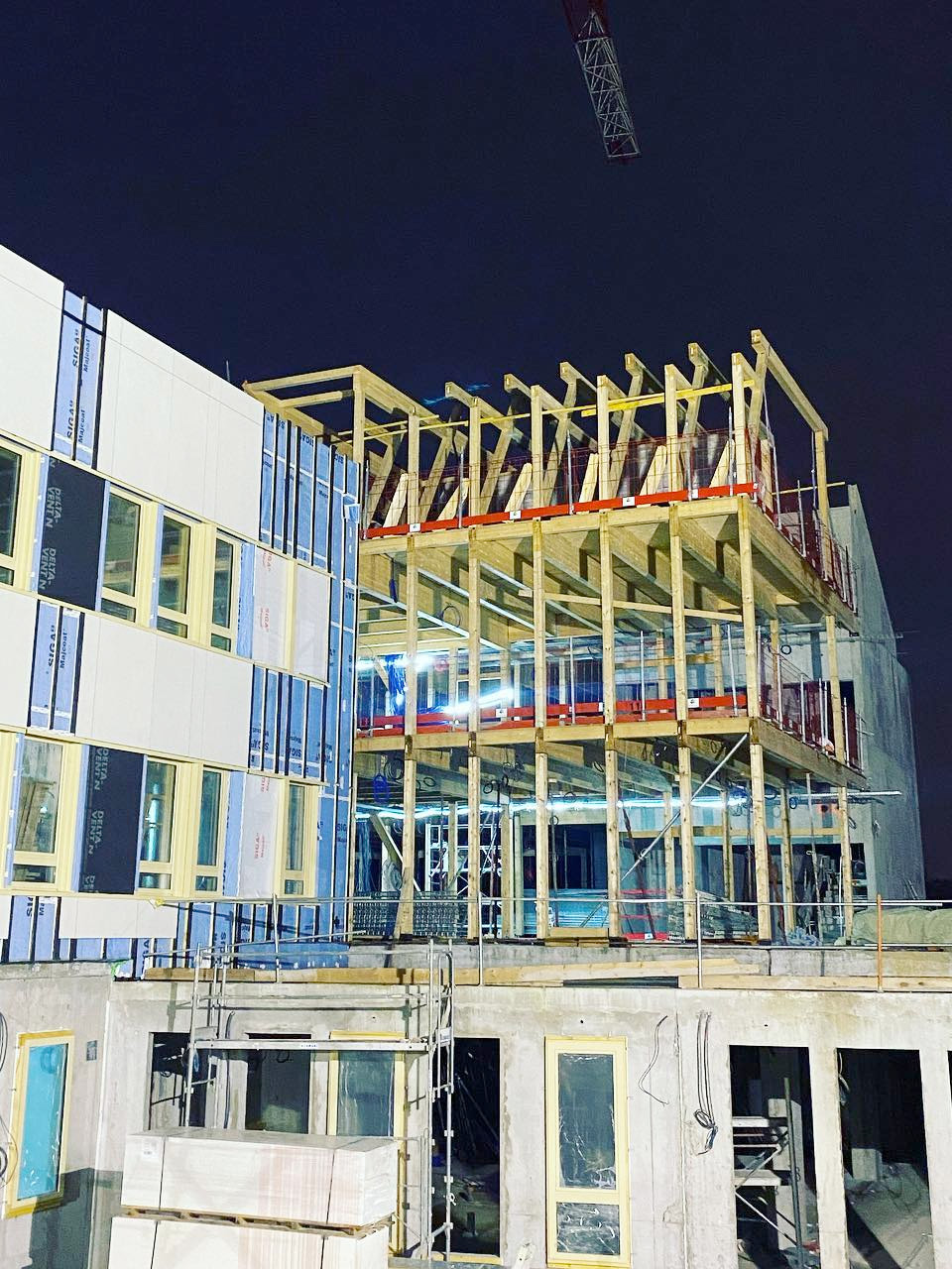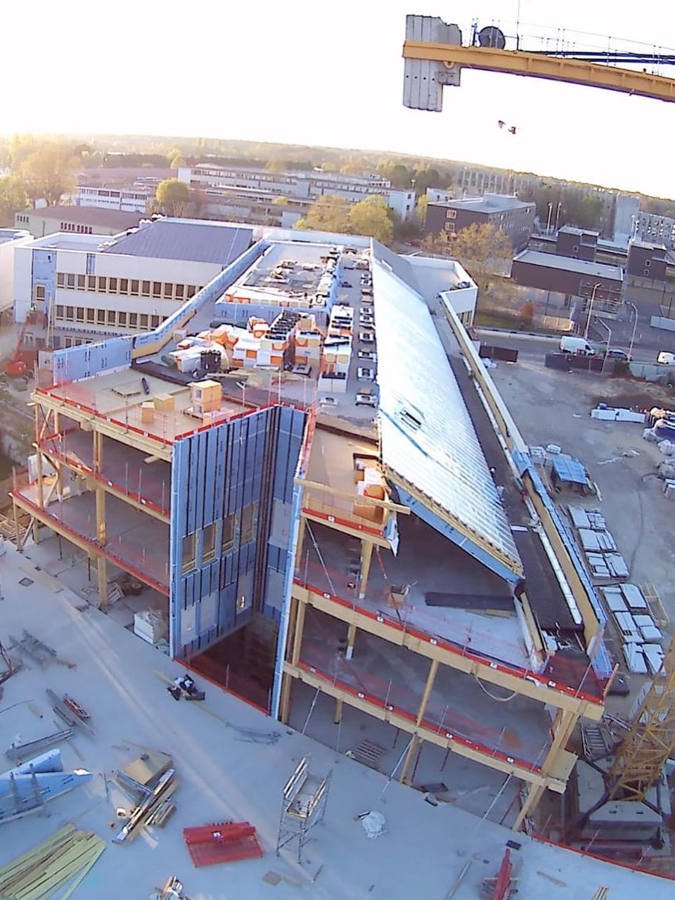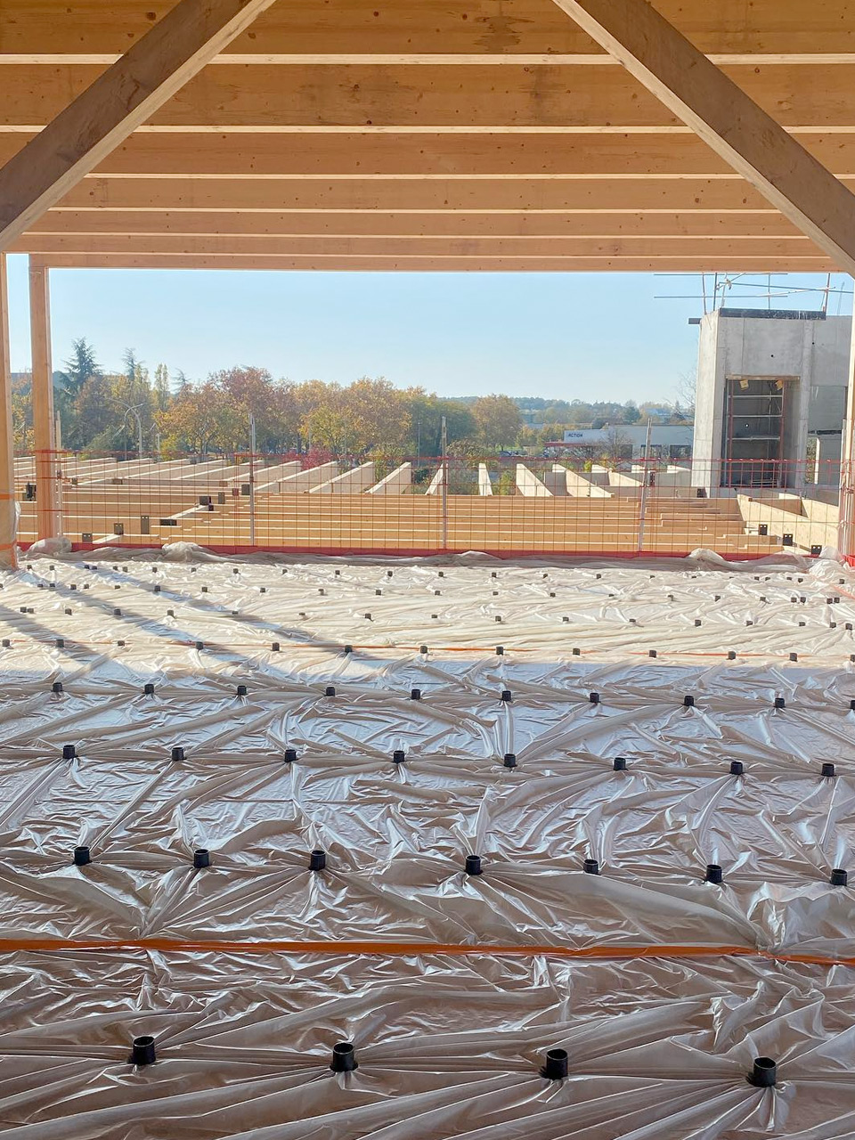 Le groupement a mis en oeuvre une structure mixte bois béton (planchers connectés), une enveloppe performante et une conception technique low tech avec en particulier un travail sur les déperditions (boucles ECS), les consommations en cuisine, une ventilation par déplacement, des brises soleils orientables et des apports en lumière naturelle de type « Lumiduc ». MEHA Charpente basé à Valenton et en charge de la structure bois et façade illustre l’aspect local du groupement.