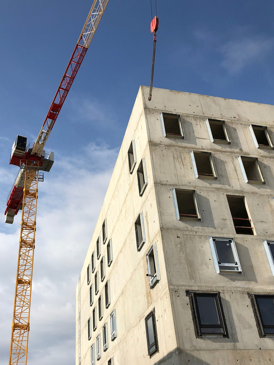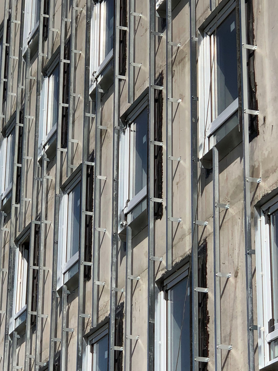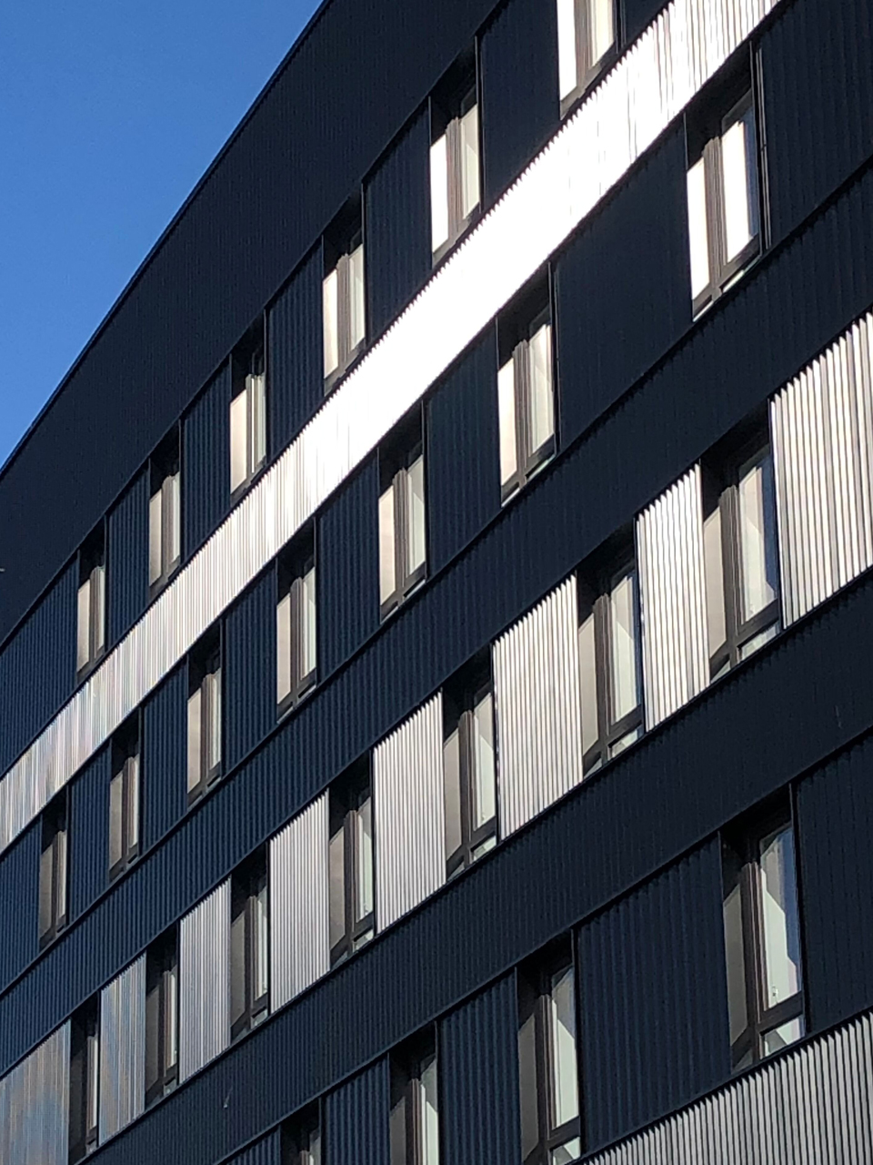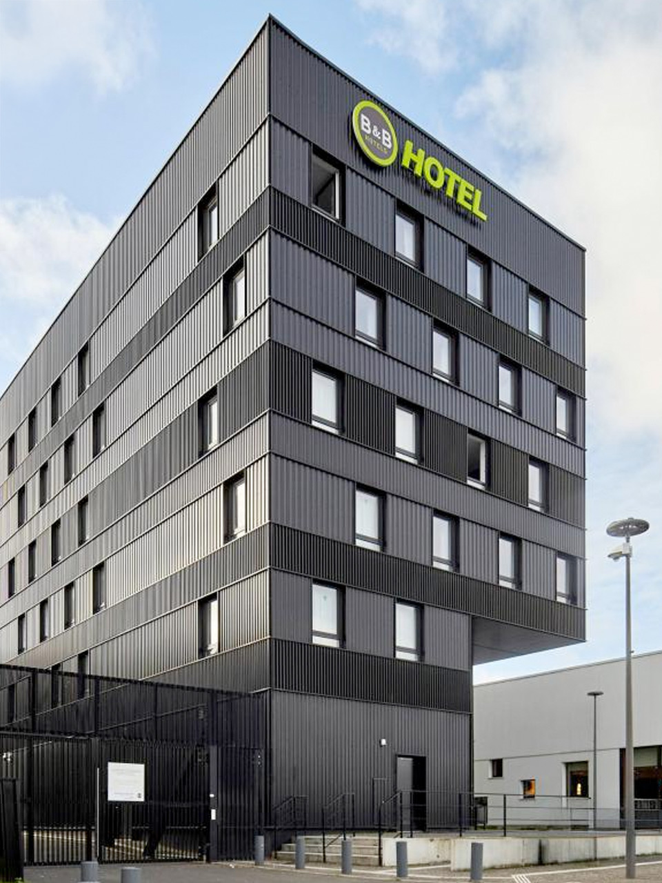 L’hôtel se distingue par une façade en bardage métallique monochrome, dont les trois types d’ondulation, juxtaposés de façon aléatoire, confèrent au volume une texture évolutive, en interaction constante avec la lumière.