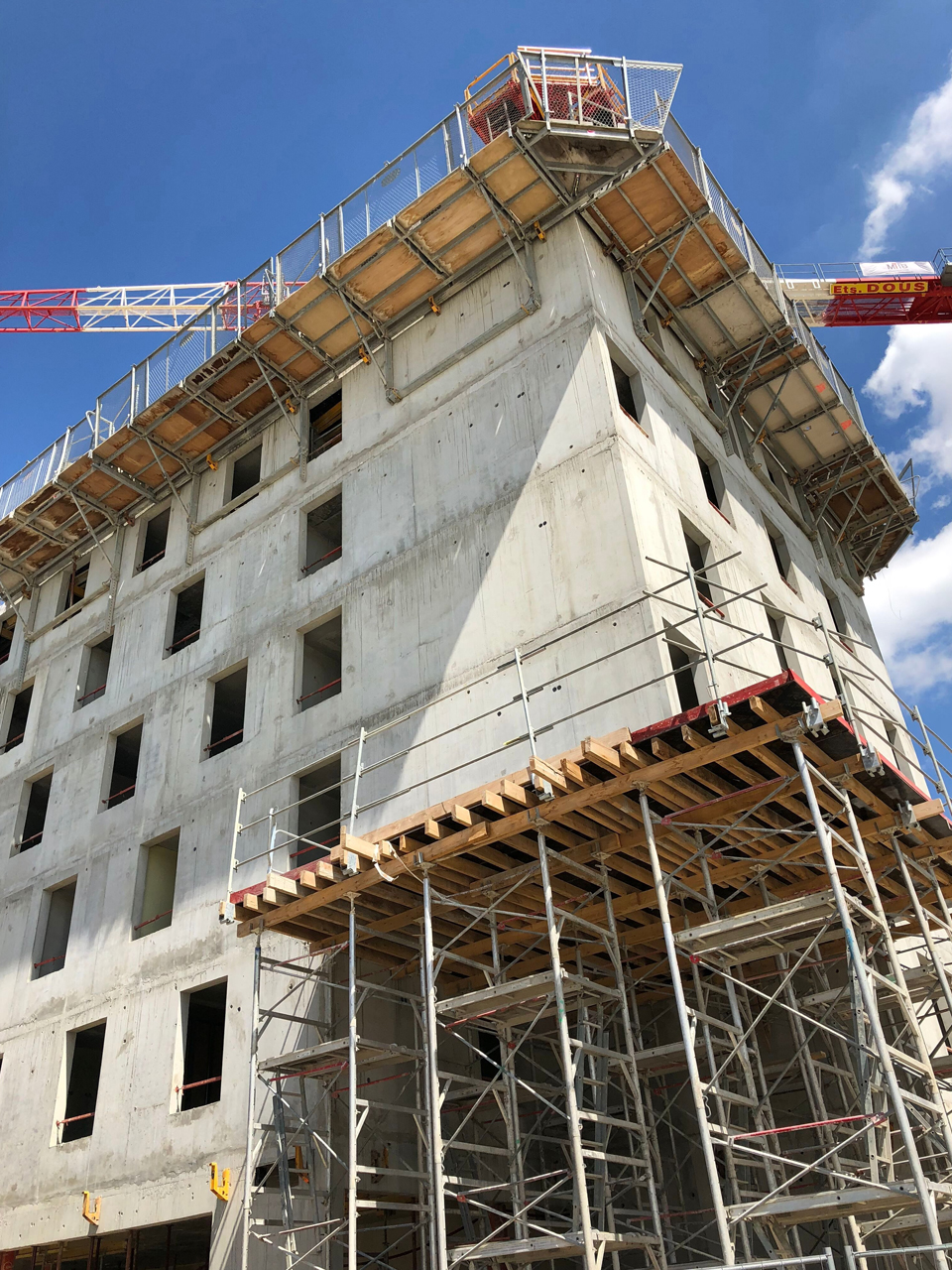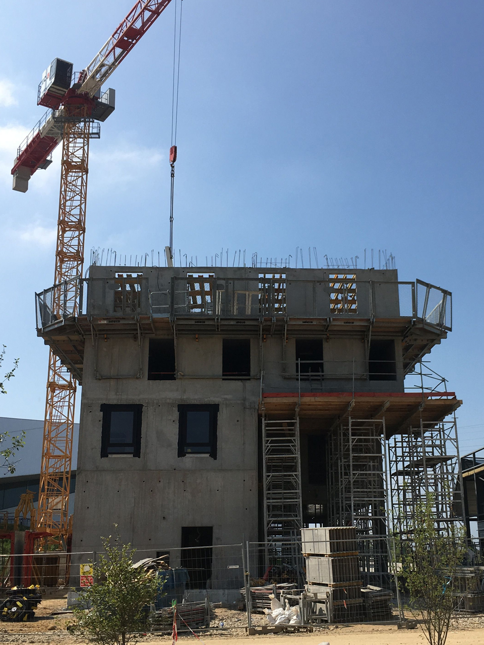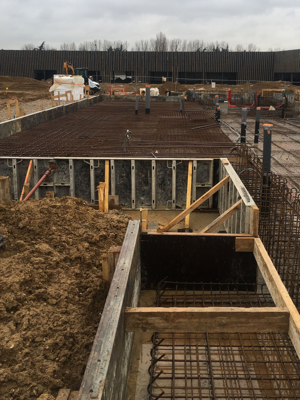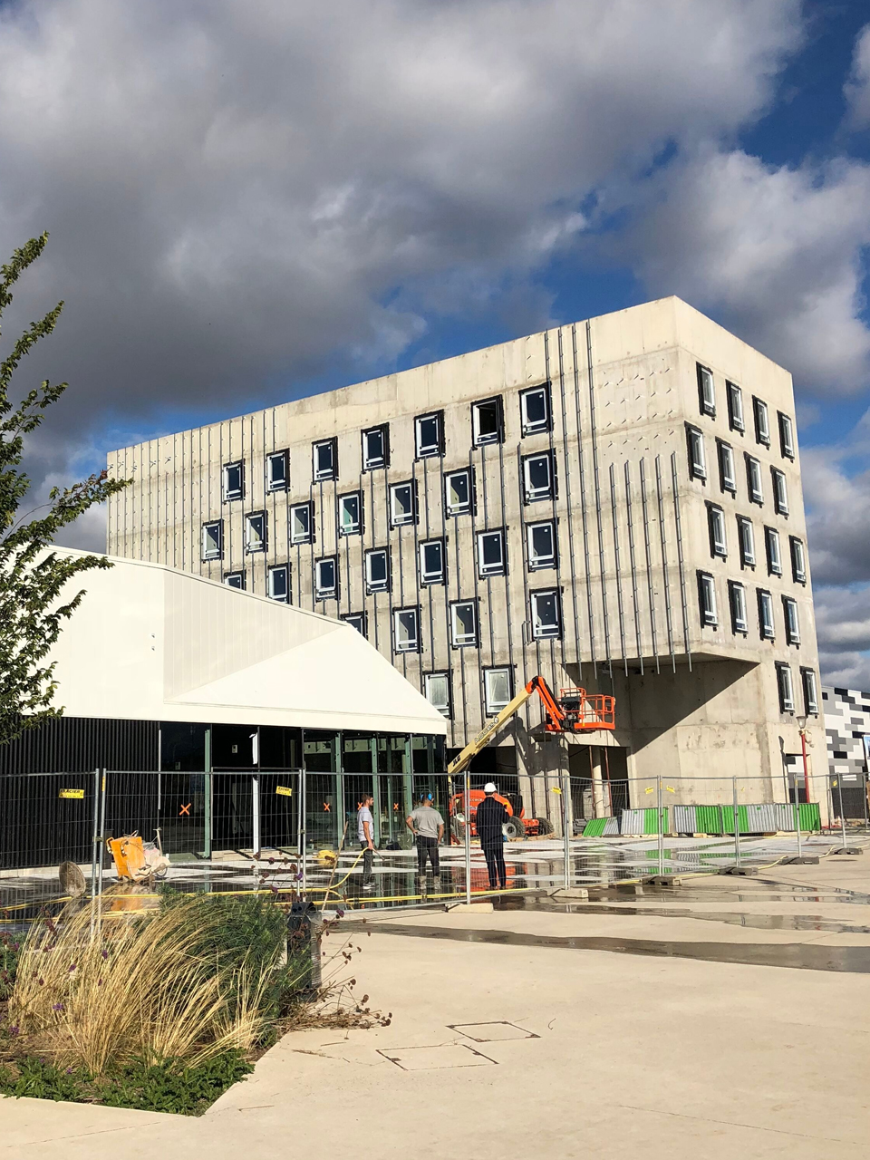 La façade en bardage métallique monochrome et ses trois types d’ondulation, juxtaposés confèrent au volume du bâtiment une texture évolutive, en interaction constante avec la lumière. La structure béton, et ses façades “drapeau » libèrent deux larges entrées en porte-à-faux.
