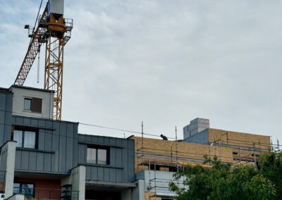 Construction d’une résidence de 25 logements, du T2 au T5, dont un duplex, avec des superficies allant de 41 à 97 m². Chaque appartement, pensé pour offrir confort, luminosité et tranquillité, bénéficie de larges baies vitrées. Certains logements disposent également d’un balcon ou d’une terrasse. Deux bâtiments composent l’ensemble : l’un de 6 étages avec ascenseur, l’autre de 3 étages, reliés par un espace paysager, avec un parking souterrain de 15 places.
