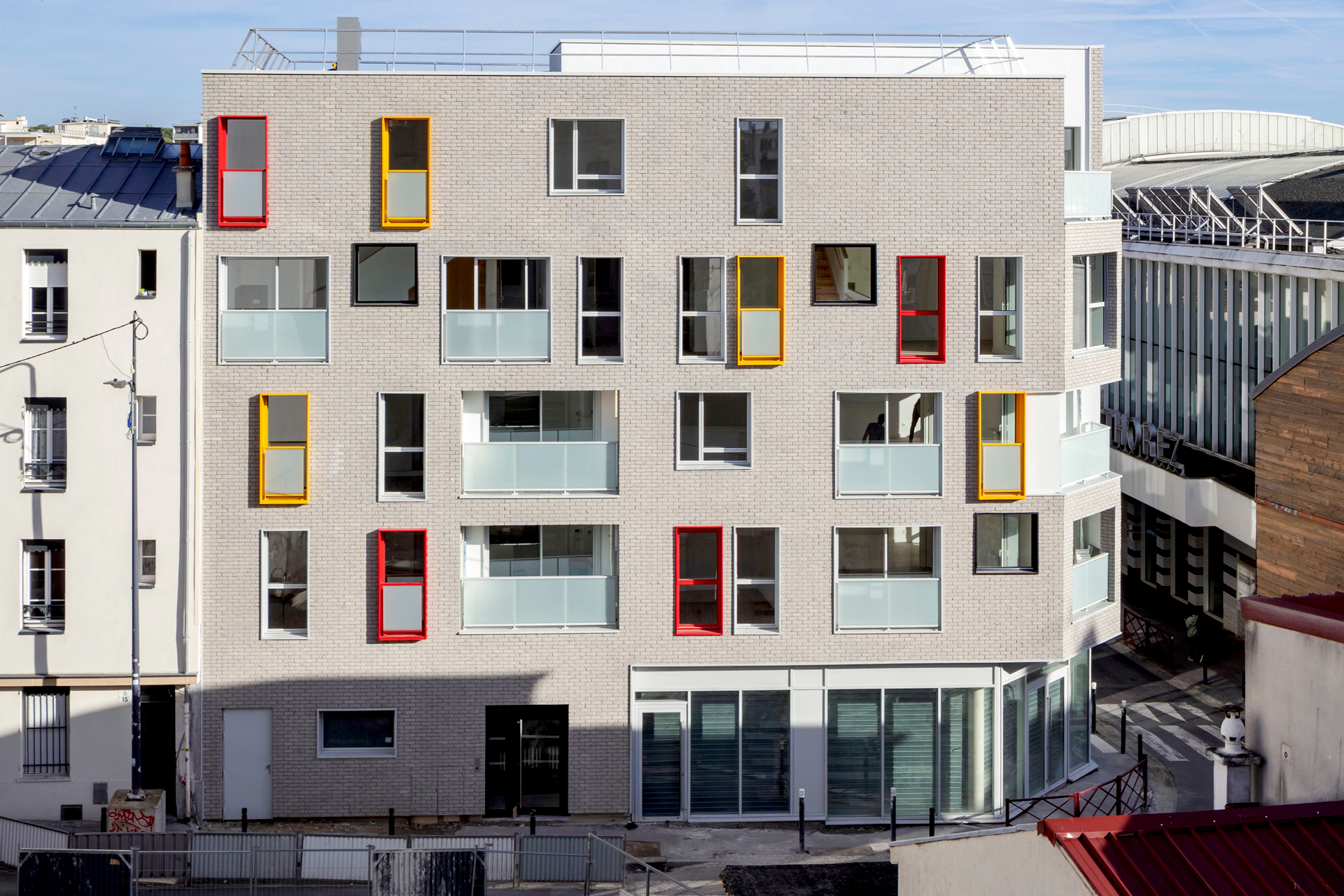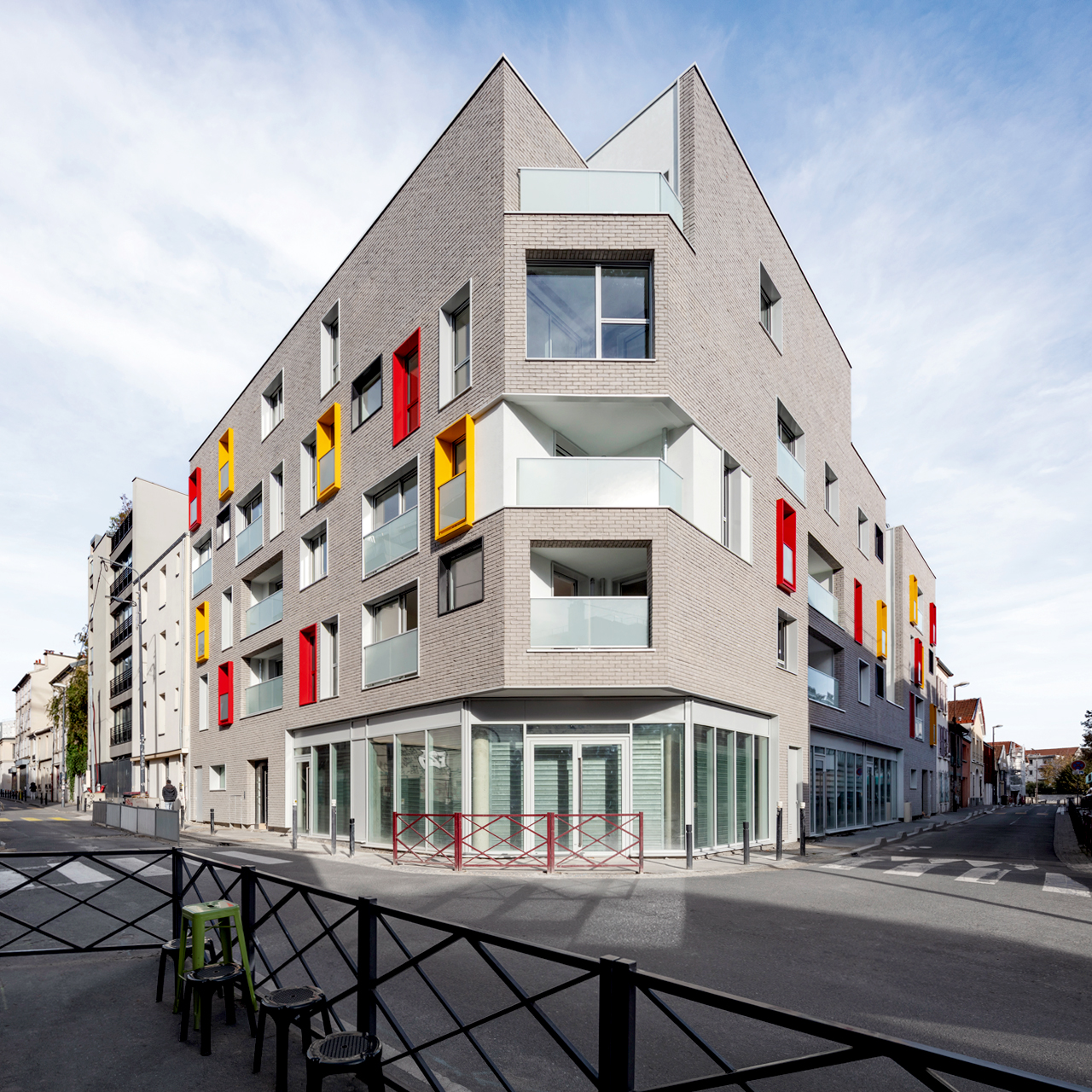 Le projet s’intègre harmonieusement à son environnement grâce à une volumétrie équilibrée (R+4 à l’ouest, R+3 à l’est) et une enveloppe en béton revêtu de briques, rythmée par des ouvertures aux teintes variées. Les façades, structurées par une trame régulière et des renfoncements formant des loggias privatives protégées par des garde-corps transparents, offrent des cadrages privilégiés sur le paysage. Respectant les contraintes urbaines, le bâtiment s’inscrit dans le gabarit imposé, avec un épannelage en hauteur et profondeur côté rue du Colonel Raynal pour assurer une transition fluide, tandis que la façade rue Édouard Vaillant adopte un profil plus linéaire en cohérence avec le bâti existant.