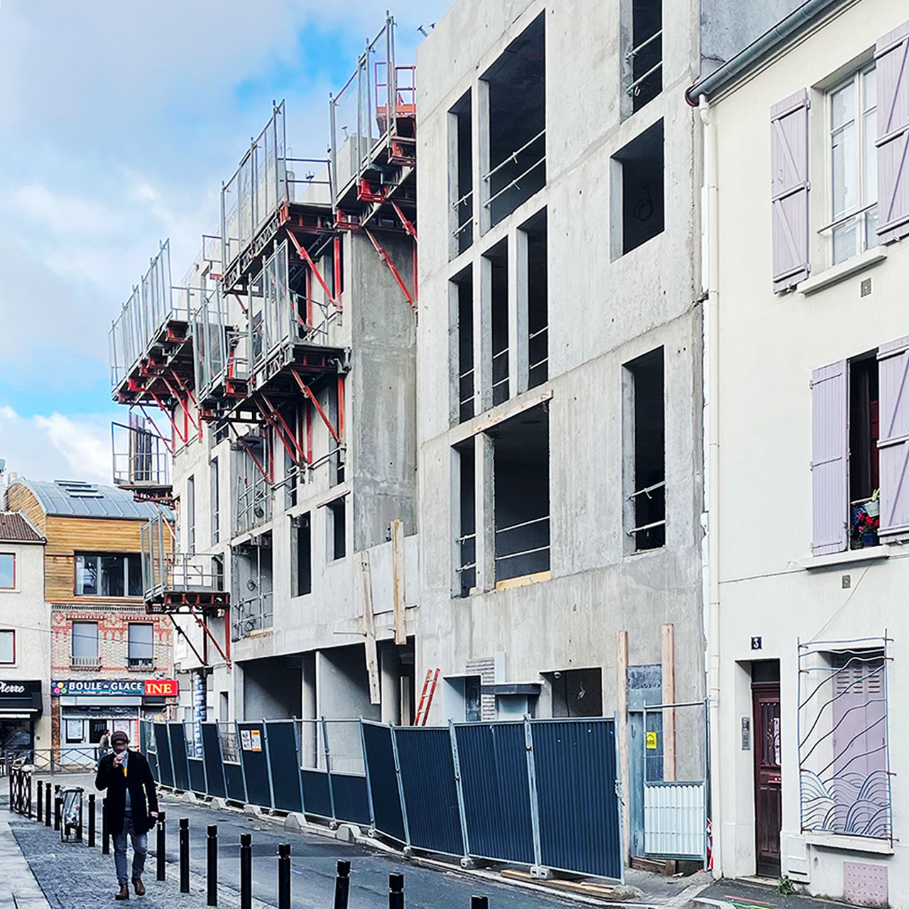 Construction d’un immeuble de 23 logements et de 5 commerces en site urbain dense. Le dialogue constant et les réunions d’information conviviales avec les riverains de Croix de Chavaux ont marqué positivement le groupement.