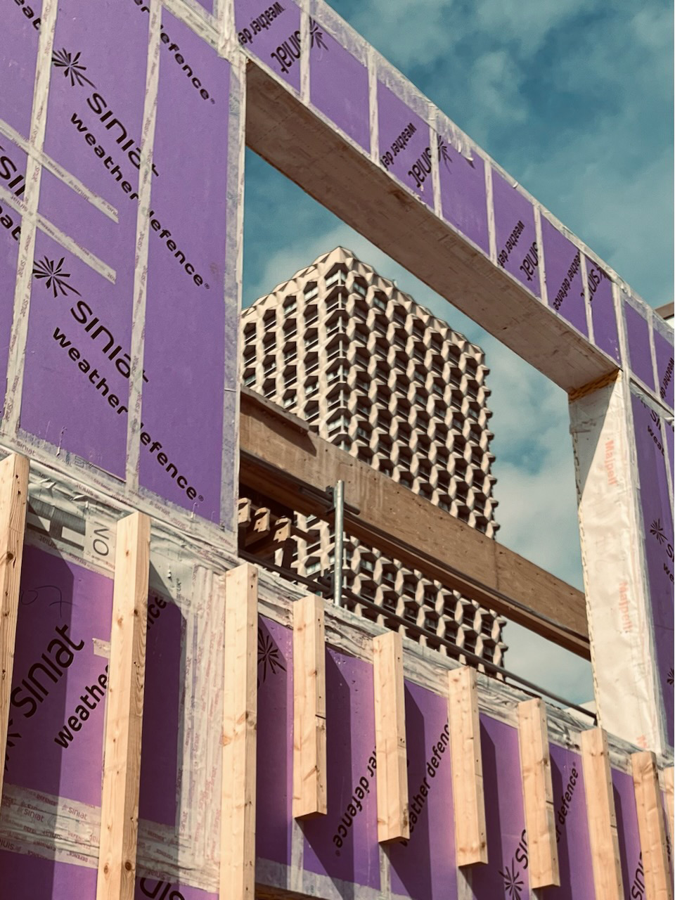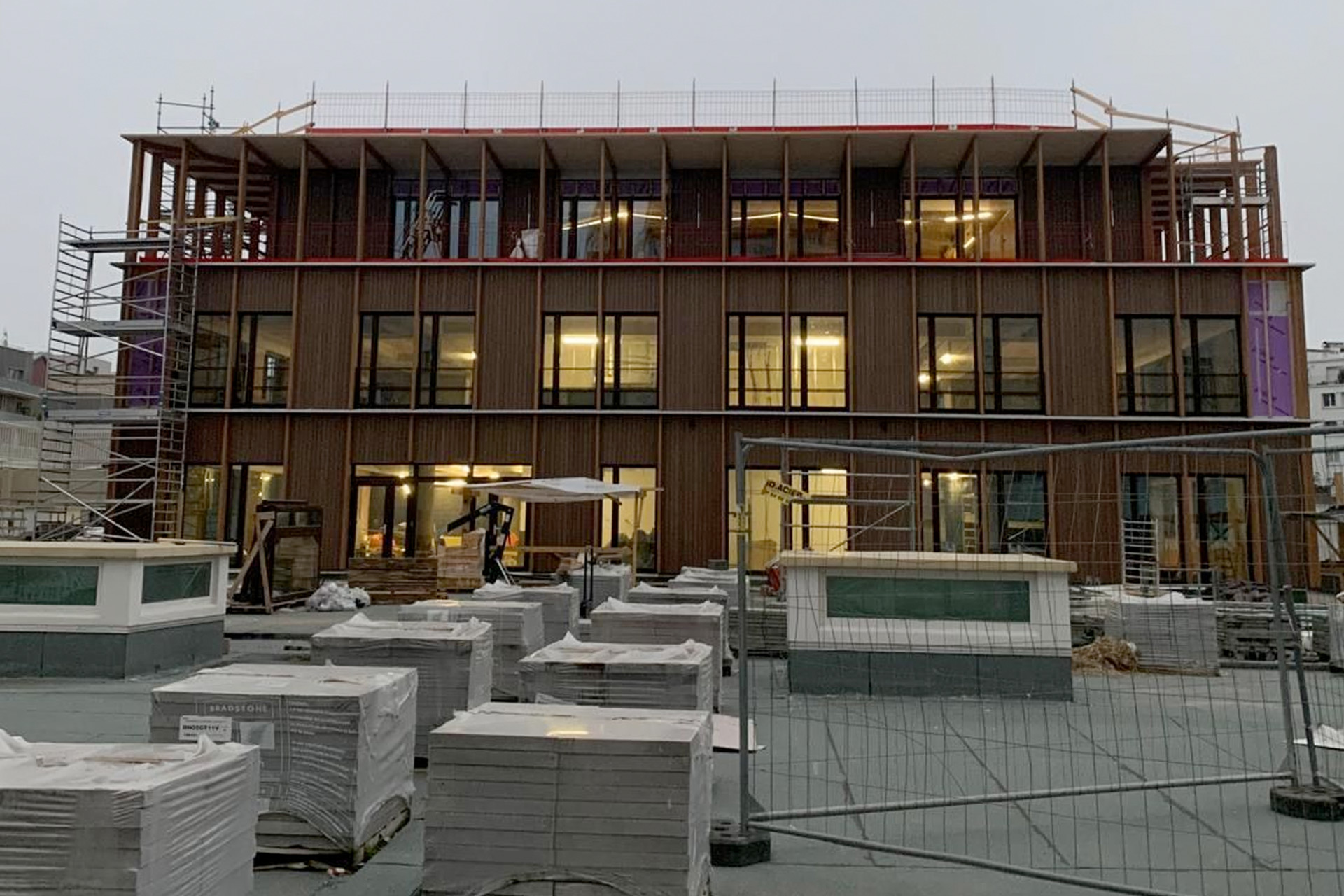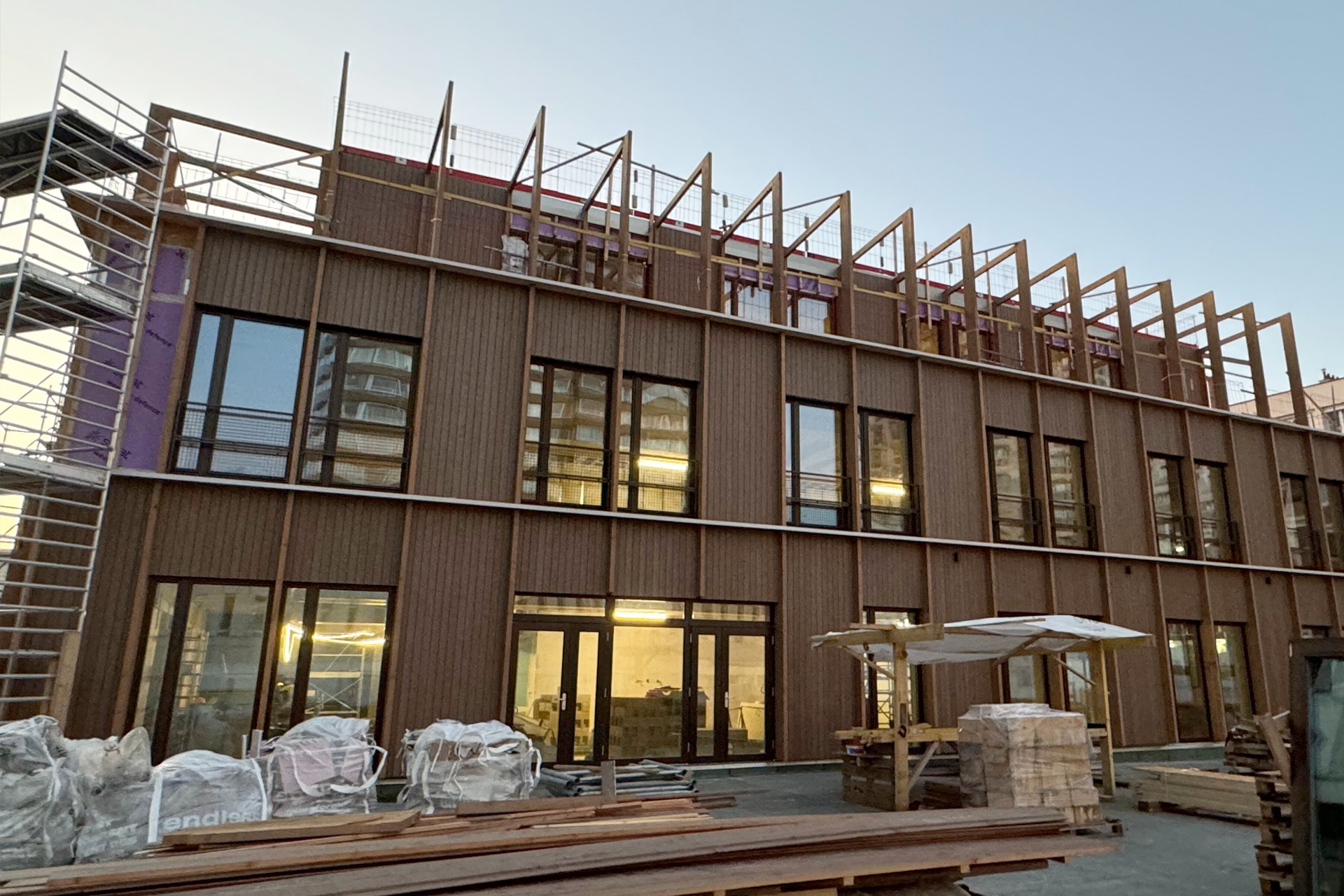 Ce chantier inclut le réemploi de matériaux issus de la déconstruction de l’existant et la mise en place d’une enveloppe passive en matériaux biosourcés et géosourcés.